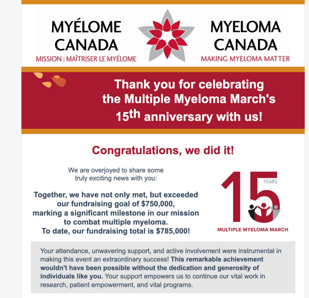 This was a very successful event with more people feeling comfortable enough to come out to the event in person. Dr. Cipra gave an opening address as well as representatives from Myeloma Canada and the Ottawa Hospital. We raised $56,000 which helps funds research towards new treatments and is split between the Ottawa Hospital and Myeloma Canada. A huge thank you to all who participated in this important event. Some photos from the walk are attached.