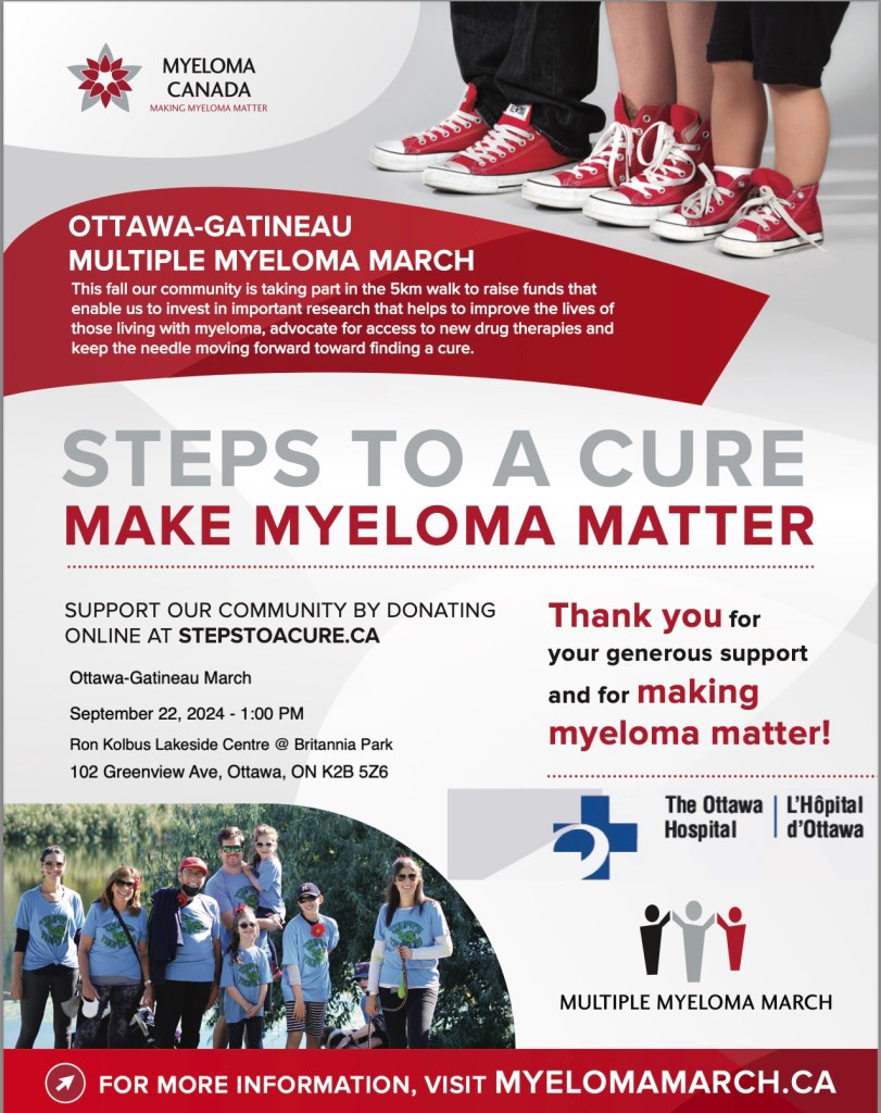 We are currently just short of two months away from this year’s Multiple Myeloma Walk. Plans are well underway. The walk is scheduled for Sunday, September 22nd at the Ron Kolbus Lakeside Centre at Britannia Park. Myeloma Canada’s website is open for on-line registrations for teams and individuals.